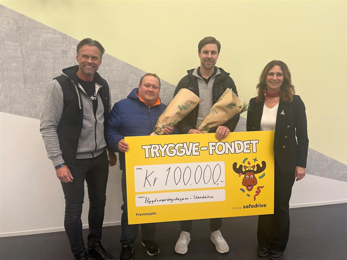 2 x 100 000 som takk for trafikksikker køyringHenning Flatjord har vunne 100 000 kroner for si trafikksikre køyring i september månad, og i tillegg får han høve til å gje ein tilsvarande sum til eitt eller fleire tiltak i sitt eige lokalsamfunn gjennom Tryggve-fondet. Bygdenæringsdagane i Stardalen er dei heldige. Tryggve-fondet er eit nasjonalt fond som:fremjar tryggare og betre lokalsamfunn.skapar engasjement blant barn og unge.skapar sosiale møteplassar som motverkar utanforskap.støttar frivilligheita, kulturlivet og idretten.bidreg til tryggare trafikk og ferdsel deler ut støtte til lag og organisasjonar som bidreg til auka inkludering og tryggare lokalsamfunn.For september månad kåra dei Henning Flatjord, som bur i Befringsvegen på Skei, som vinnar. Henning har vunne 100 000 kroner for si trafikksikre køyring i september månad, og i tillegg får han høve til å gje ein tilsvarande sum til eitt eller fleire tiltak i sitt eige lokalsamfunn. Han valde Bygdenæringsdagane i Stardalen. Onsdag 17. desember blei sjekken delt ut på rådhuset.Les meir om Tryggve-fondet Sist endra 17.12.2025 16.19