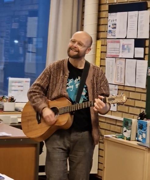 Det var god stemning og engasjerte elevar, då han fortalde om livet som forfattar, musikar og illustratør.