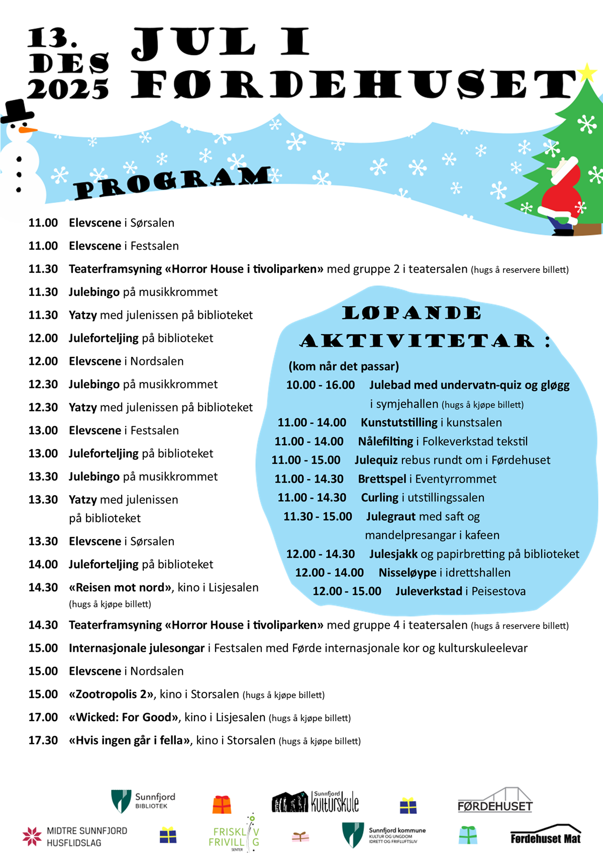 Jul i Førdehuset 13.12.2025Laurdag 13. desember 2025🎄 JUL I FØRDEHUSETVelkommen til Jul i Førdehuset – ein dag fylt med ekte julestemning, aktivitetar og opplevingar for heile familien!Det blir musikk, teater, juleverkstad, leik, quiz og mykje meir – alt samla under eitt tak i Førdehuset.Ta med små og store til ein triveleg førjulsdag full av latter, kreativitet og gode augneblinkar. PROGRAM11.00• Elevscene – Sørsalen• Elevscene – Festsalen11.30• Teaterframsyning Horror House – i tivoliparken (Teatergruppe 2) – Teatersalen (hugs å reservere billett)• Julebingo – Musikkrommet• Yatzy med julenissen – Biblioteket12.00• Juleforteljing – Biblioteket• Elevscene – Nordsalen12.30• Julebingo – Musikkrommet• Yatzy med julenissen – Biblioteket13.00• Elevscene – Festsalen• Juleforteljing – Biblioteket13.30• Julebingo – Musikkrommet• Yatzy med julenissen – Biblioteket• Elevscene – Sørsalen14.00• Juleforteljing – Biblioteket14.30• Kino: Reisen mot nord – Lisjesalen (hugs å kjøpe billett)• Teaterframsyning Horror House – i tivoliparken (Teatergruppe 4) – Teatersalen (hugs å reservere billett)15.00• Internasjonale julesongar – Festsalen (Førde internasjonale kor og kulturskuleelevar)• Elevscene – Nordsalen• Kino: Zootropolis 2 – Storsalen (hugs å kjøpe billett)17.00• Kino: Wicked: For Good – Lisjesalen (hugs å kjøpe billett)17.30• Kino: Hvis ingen går i fella – Storsalen (hugs å kjøpe billett)LØPANDE AKTIVITETAR10.00 – 16.00• Julebad med undervass-quiz og gløgg – Symjehallen(hugs å kjøpe billett)11.00 – 14.00• Kunstutstilling – Kunstsalen• Nålefilting – Folkeverkstad tekstil11.00 – 15.00• Julequiz – Rebus rundt om i Førdehuset11.00 – 14.30• Brettspel – Eventyrrommet• Curling – Utstillingssalen11.30 – 15.00• Julegraut med saft og mandelpremiar – Kafeen12.00 – 14.30• Julesjakk og papirbretting – Biblioteket12.00 – 14.00• Nisseløype – Idrettshallen12.00 – 15.00• Juleverkstad – Peisestova🎟 Billettar og reservasjonar: fordehuset.noVelkommen til ein magisk førjulsdag i Førdehuset! Sist endra 25.11.2025 12.17