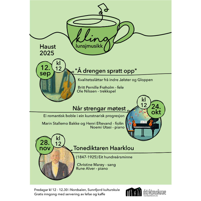 Hausten 2025 inviterer distriktsmusikarane i Sunnfjord til tre gratis lunsjkonsertar i Nordsalen på Sunnfjord kulturskule. Her får du høyre høgkvalitets musikk i lunsjtida – servert på ein halvtime, med kaffi og lefse attåt. Ein liten, men rik oppleving som gjer fredagen ekstra god.
