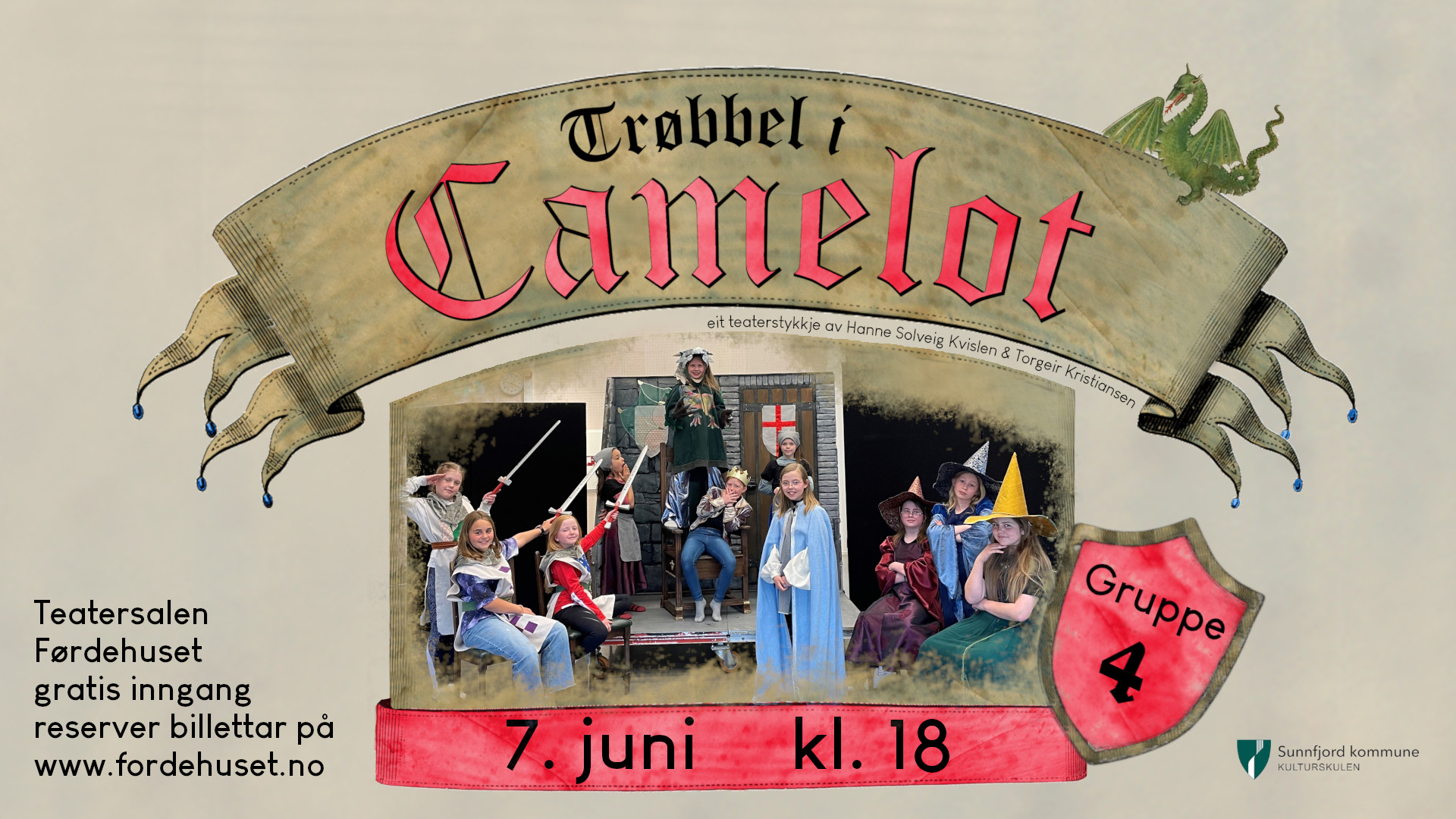 "Dragen trugar byen Camelot, og folket ser seg nøydd til å flykte. Kong Arthur og riddarane hans har allereie nok å gjere med å hindre dei tre heksene Ella, Bella og Stella i å angripe slottet. Dei er dessutan veldig redde, derfor blir Merlin, som er tenestegut ved slottet, kledd ut som konge og sendt for å møte dragen..." Slik byrjar dette musikalske eventyret, framført av teaterelevene i Sunnfjord kulturskule.