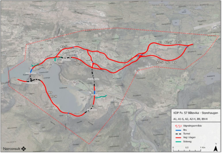 Planforslaget har 3 hovudalternativ til trasé gjennom området pluss 3 variantar av dei. A alternativa går frå Båtevika med bru over Svædsundet og i ein trasé nord for Bygstadhaugen og Eidavika. B alternativet går frå Båtevika til Osen kor vegen kryssar over Gaula med bru og fortsett vidare i tunnel gjennom Alefjellet og opp til Hjelmeland.