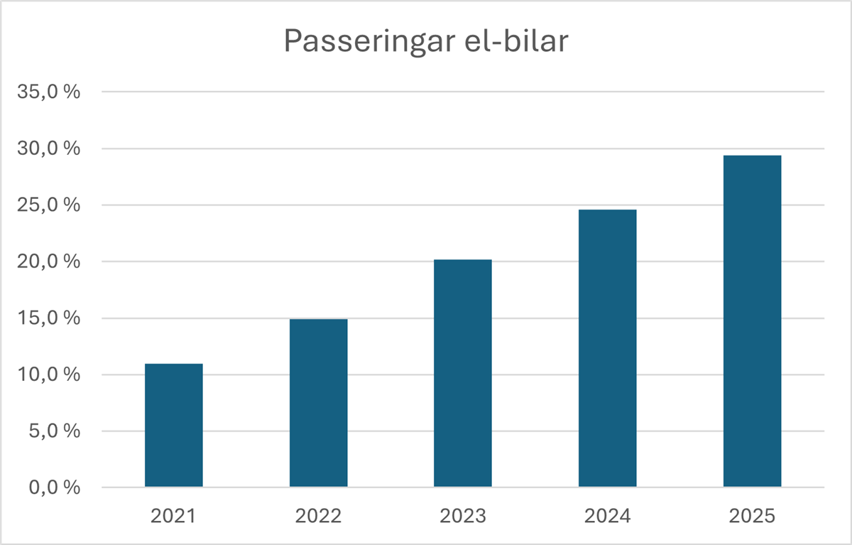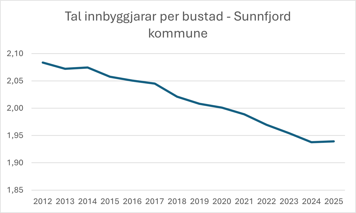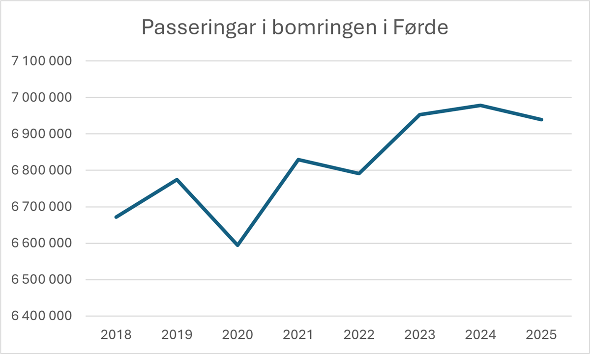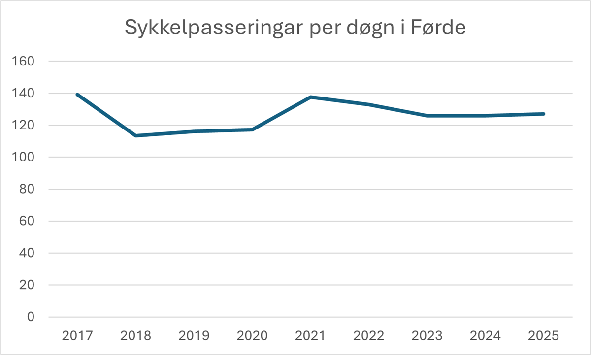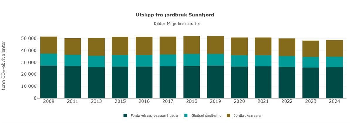 KlimabarometerSunnfjord kommune sitt klimabarometer er eit uttrykk for om vi er på rett veg mot lågutsleppsamfunnet. Utsleppa går nedover, i hovudsak grunna overgang til elbilar, men forbruket er altfor høgt.Direkte utslepp skjer innanfor kommunegrensa. Dei forbruksbaserte utsleppa skjer i stor grad gjennom produksjon og transport i andre land. For å unngå meir enn 1,5 grader global oppvarming, må kvar innbyggar redusere klimafotavtrykket sitt frå 13 til 3 tonn CO2e innan 2030.Kjelder: Miljødirektoratet, Ducky. Transport Trafikken aukar, men det blir fleire elektriske køyretøy, i hovudsak personbilar. Sunnfjord kommune er på god veg til elektrifisering av den kommunale bilparken, i hovudsak person- og varebilar.Passasjertalet på Bybussen i Førde er aukande etter koronapandemien. Tala for 2024 er høgre enn diagrammet viser, då tal frå desember ikkje er tilgjengeleg. På strekninga Førde-Florø er det om lag like mange passasjerar som på Bybussen i 2023.Trafikkteljarane i Førde målar tal sykkelpasseringar. Tal syklande per døgn er relativt stabilt per år.Passasjertalet ved Førde lufthamn er på veg oppover igjen etter koronapandemien. Kjelde: Ferde, Skyss, Statens vegvesen, AvinorIllustrasjonar: Gregory IdehenBustadDet bur stadig færre personar i kvar bustad i Sunnfjord. Einebustader dominerer med 60 % av bygningsmassen. Kjelder: SSBArealbrukSkog er den store faktoren i høve til å binde karbon i vår kommune. Utviklinga viser diverre at nedbygging av både skog, jordbruksareal og myr fører til redusert binding og auka utslepp. Kjelde: MiljødirektoratetJordbrukRundt halvparten av dei direkte utsleppa i Sunnfjord kommune kjem frå jordbruket, som heng saman med stor husdyrproduksjon. Klimagassutsleppa frå jordbruket har i liten grad endra seg sidan dei første tala frå 2009.Kjelde: Miljødirektoratet.EnergiforbrukBustader og fritidsbustader utgjer rundt halve forbruket av straum i Sunnfjord kommune. Forbruket svingar med årlege variasjonar i prisar og klimatiske forhold. Kva kan vi gjere?Samarbeide om nye løysingarRedusere forbruketSpare straumTa bussen, gå eller sykle når du kanEte klimavenleg – matvett.noFinn klimafotavtrykket ditt i klimakalkulatoren KjelderMiljødirektoratet, Folkets Fotavtrykk, Sunnfjord kommune. Illustrasjon: Gregory Idehen Sist endra 06.02.2026 10.22